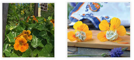 We also have beautiful China jade cucumbers growing on a teepee behind the garden beds, along with nasturtium. Nasturtiums are an excellent garden companion for many vegetables, and work well with cucumbers and other squash plants because they repel cucumber beetles. Nasturtiums are also an edible plant: their leaves and flowers have a spicy, peppery taste, while the flowers have a more mild and floral flavor than the leaves. I love stuffing the flowers with a little cream cheese and dill, making a pretty little appetizer or garden snack.