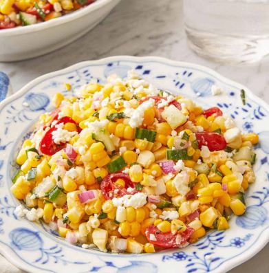 - To the dressing, add the corn kernels, cucumber, tomatoes, red onion, feta cheese, and basil. Stir until well mixed. Cover and chill for at least one hour before servings. The salad can be refrigerated for up to 3 days.