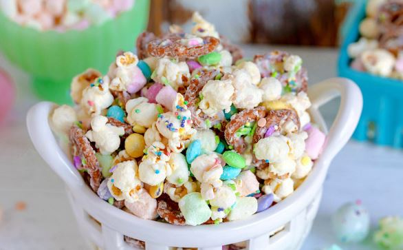 - Add popcorn and pretzels to a very large bowl. (If you don't have a bowl big enough, simply line a large baking sheet with parchment paper or a silicone mat and mix on top.)