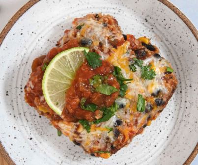 - Remove from oven and let cool for 5 minutes before serving. Serve topped with avocado or guacamole, fresh cilantro and salsa.