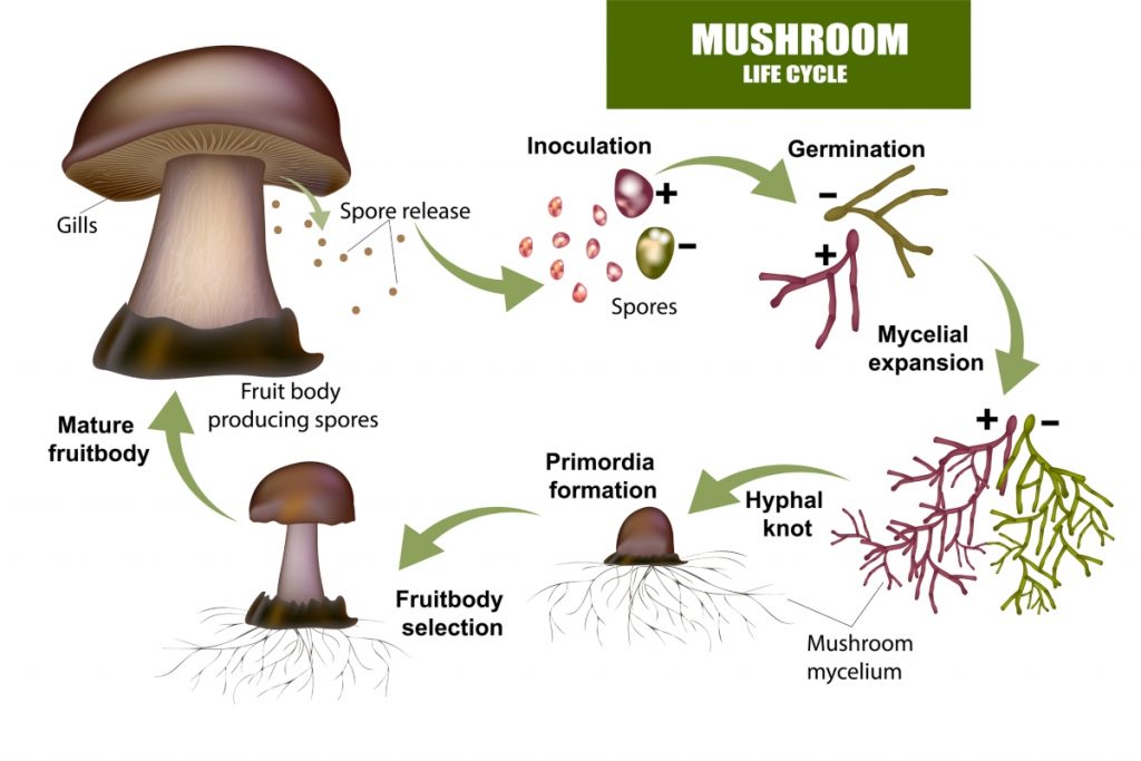 Before diving into mushroom foraging, cooking, and growing, it's important to understand some basic information about mushrooms. Firstly, mushrooms are not plants! They are multicellular eukaryotes that are classified as fungi, which is genetically closer to humans than to plants. The mushroom life cycle is somewhat similar to a plant life cycle, but instead of seeds, mushrooms spread via spores. After the spores germinate, they form an underground body called mycelium, and then begin to form into primordium. After this, the "fruit" of the mushroom begins to grow from the ground-- this is the stem and cap of the mushroom that we can see! The part of the mushroom that we see aboveground is comparable to an apple growing from an apple tree-- it is simply the fruit, not the main body of the organism.