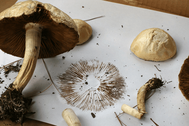 If you are interested in foraging for wild mushrooms, there are many environments where you can get started! Try foraging in local woodlands, parks, and even urban settings or your own backyard. When identifying mushrooms, it is recommended to learn with a mushroom guide to make sure your identifications are one hundred percent accurate. Mushroom hunters can also use spore prints to positively identify a mushroom. Spore prints are like a fingerprint for a mushroom. To take a spore print, the stem of the mushroom is removed to expose its gills underneath. The cap of the mushroom is placed, gills down, on a piece of paper and a cup is placed overtop. After leaving the mushroom for a few hours or overnight, the design and color of the spore print left on the paper can provide a positive mushroom ID!