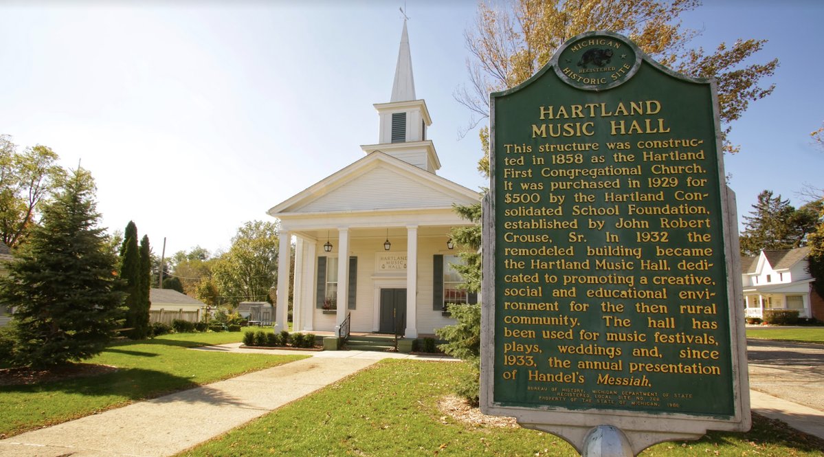 The historic Hartland Music Hall is available for rent to families hosting weddings, to studios offering dance and music recitals, to organizations offering lecture or other series, for graduations, charter, private, and preschool theater and music events, and various other purposes. The Hall's elegant auditorium seats 220 (including balcony) and rental includes a grand piano, stage, stage lighting and sound system, and the historic Kilgen Pipe Organ is also available (with permission of the caretaker and use by an approved organist). The building includes a "green room," handicapped accessible restrooms and in the lower level, and a large dressing room. Reserve online by clicking here, or call (810) 632-5200 x 118 for more information.