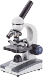 The AmScope M150C-PS25 monocular compound microscope has interchangeable 10x widefield and 25x widefield eyepieces, a forward-facing nosepiece with three DIN achromatic objectives, LED illumination, a 0.65 NA single-lens condenser, coaxial coarse